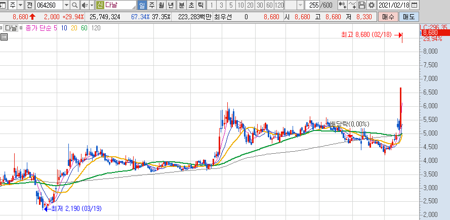 다날은 오늘 점상한가를 갔을 정도로 매수에 힘이 강한 주인데요. 쿠팡과는 휴대폰 결제 점유율 1위 기업입니다. 사실 쿠팡뿐만 아니라 코로나로 인해서 배달의 민족 등 휴대폰 결제가 늘어나면 결제 수해주로 올라왔습니다.